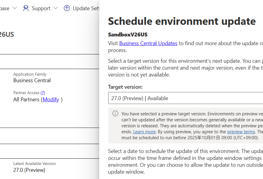 今回はD365BCの既存環境のバージョンを次のメジャーバージョンのプレビュー環境にアップグレードする方法を紹介します。 この機能は利用可能になったのが9月ですが、リリースとしては2025 Releas