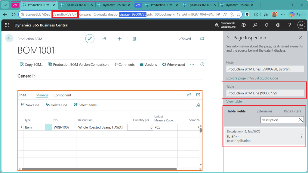 V27の同じページを見てみます。”Description”はありますが、”Description2”は存在しません。V28で項目追加された、ということです。そしてページ検査モードで見ると、このページ(正確にはフォーカスしているラインタブのサブフォームページ)のソースとなるテーブルを確認できます。”9900772:Production BOM Line”テーブルで、これは冒頭に載せた”V28でDescriptionが追加されたテーブル”のExcelに含まれているテーブルです。
