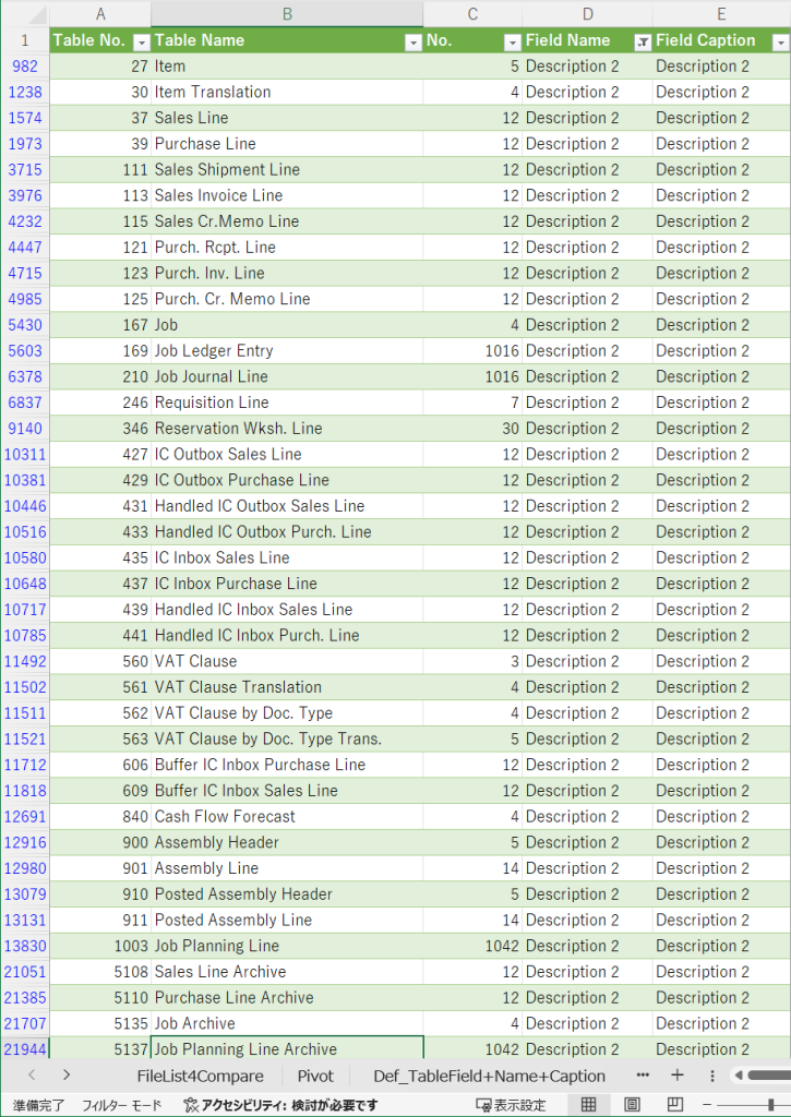 参考までに、V27時点で”Description2”(説明2)を持っているテーブルの一覧の一部です。全部表示しきれていないですが、フィルタして数えたところ88個ありました。受発注伝票や棚卸伝票、在庫移動伝票、アレンブリーオーダーなど、ロジ系の伝票明細で多くもている印象です。今回追加されたのは生産管理系の明細テーブルなので、これまでの流れを汲んで拡張したことがわかります。