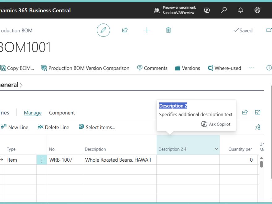 Production BOMのラインに品目を指定すると、品目マスタのDescription2が読み込まれます。