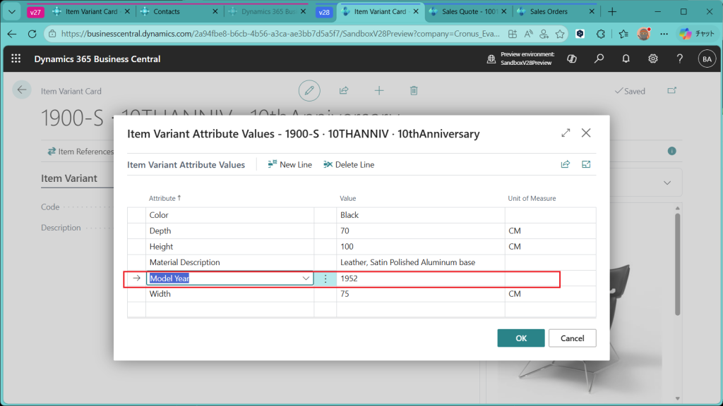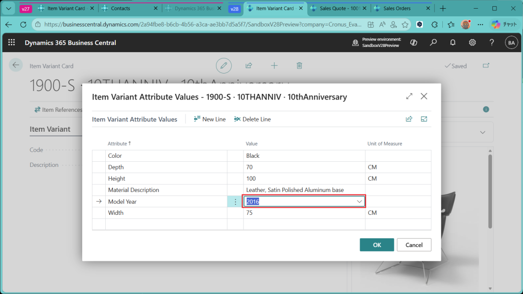 既にいくつかの属性が定義されています。これはバリアントの元品目の属性がそのまま継承されているだけです。モデルの年度という属性があります。これを変更してみましょう。