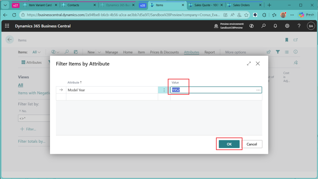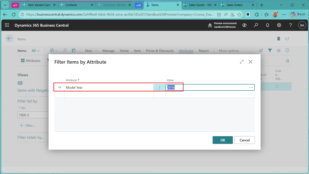 属性情報は検索性を高めるという役割があるので、モデル年度で検索してみます。品目一覧画面で”Filter by Attributes”クリック。