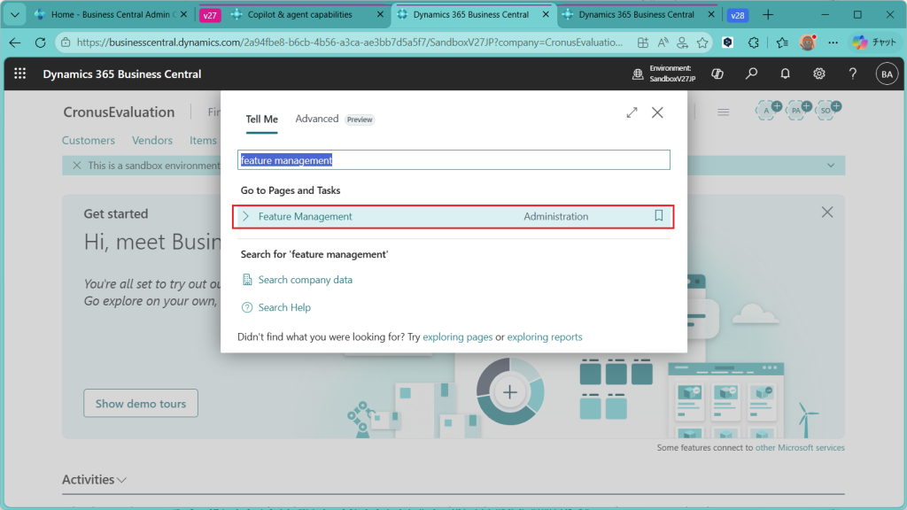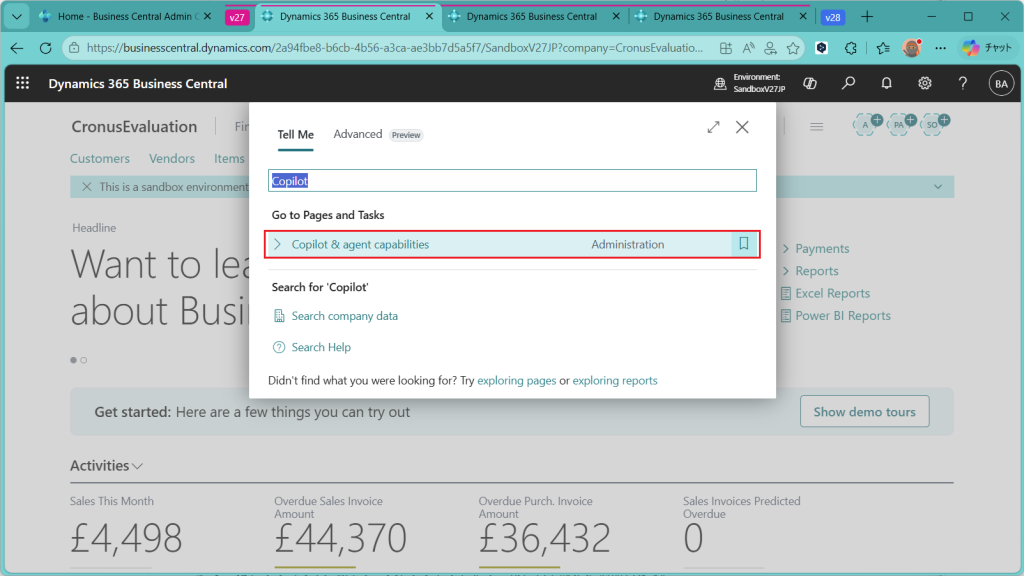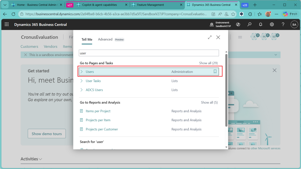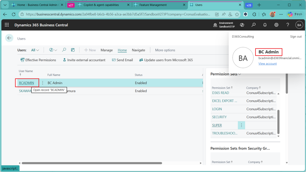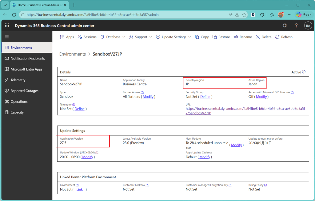 設定する環境ですが、Business Centralのバージョン27.5でJPリージョンの環境を使います。