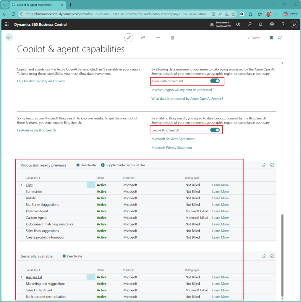 その下の明細部分はプレビュー機能とGA済の機能の一覧です。使わせたくない機能は個別にOffにできますが、今回は調査なのでデフォルトの通りすべて”Active”のままにしておきます。なお、この一覧で請求対象かどうかがわかります。”Payable Agent(買掛管理エージェント)”、”Custome Agent(カスタムエージェント)”、”Sales Order Agent(販売管理エージェント)”の3つ以外は追加課金されません。