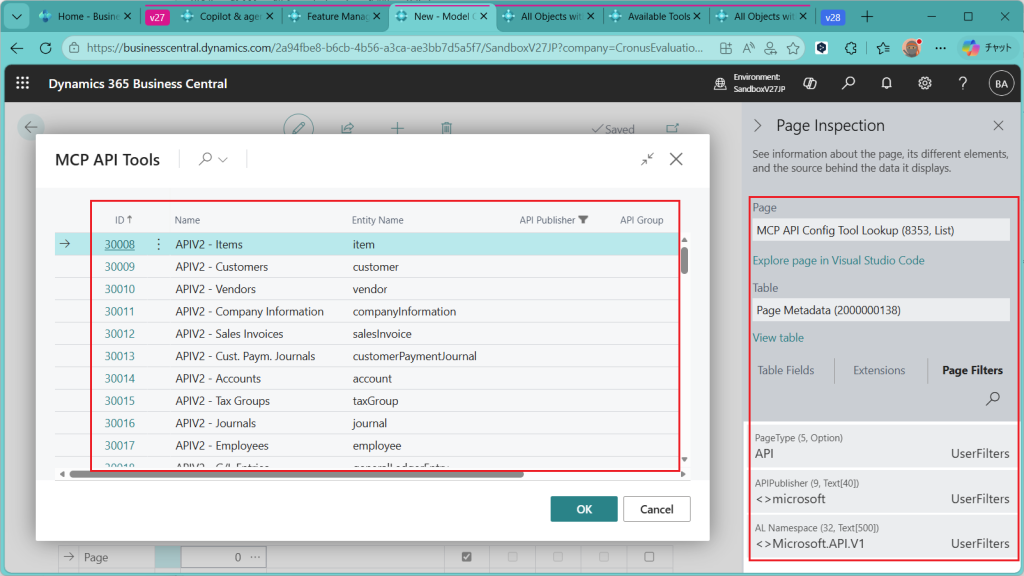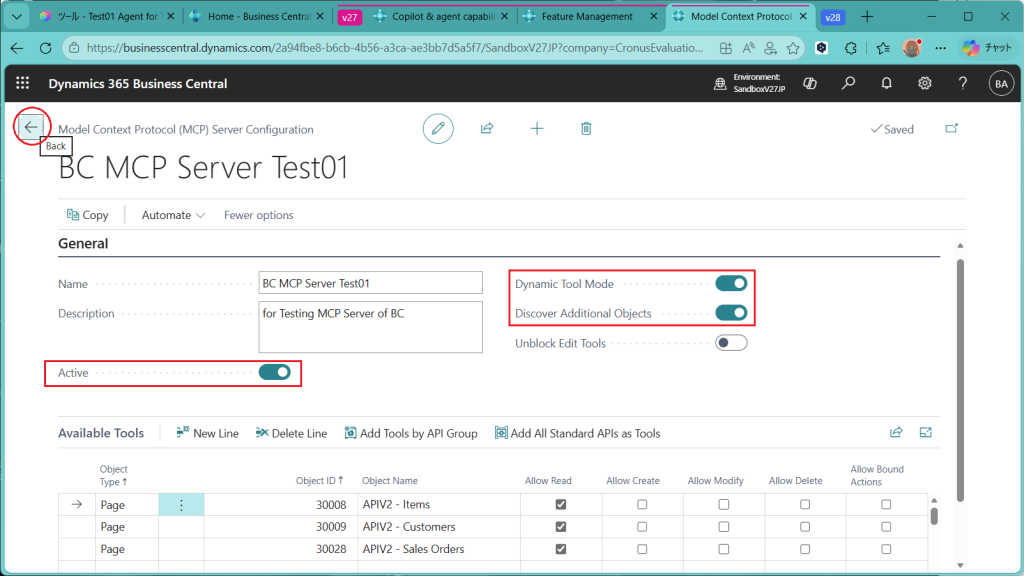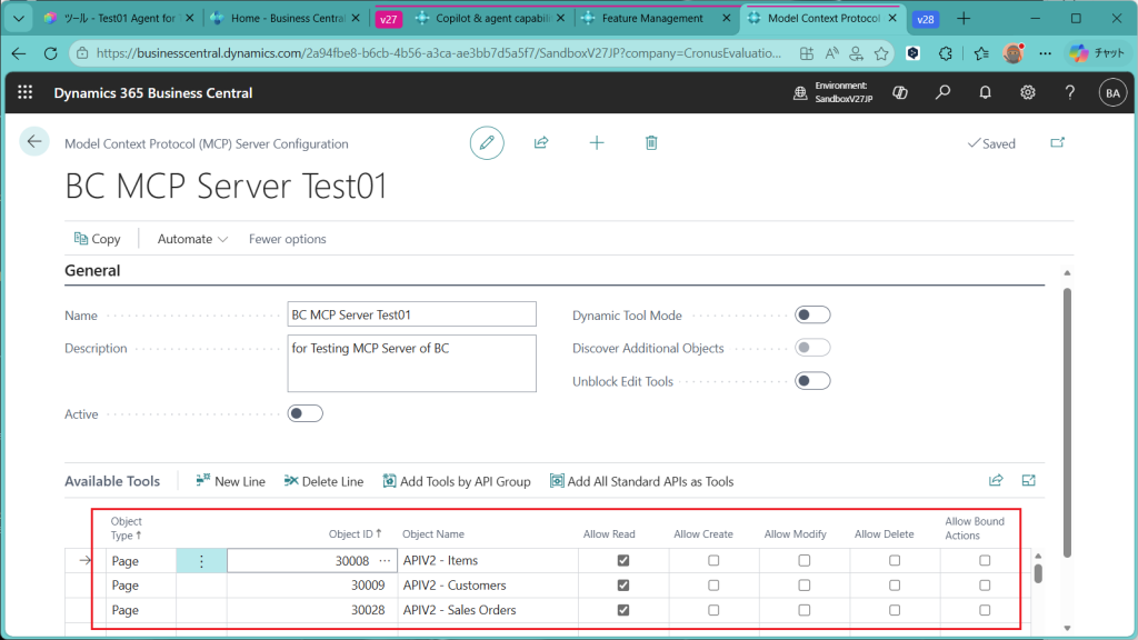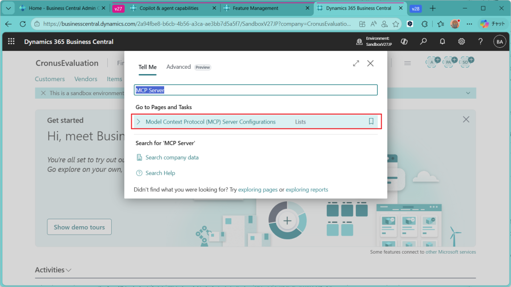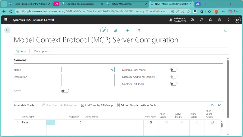 Business CentralのMCPサーバーというツールが追加されました。画面の全体像はこんな感じです。