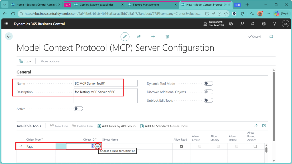 名前とDescriptionを入力し、Available Toolsセクションで公開対象のページとアクセス権を設定します。とりあえず、ページをいくつか追加してみます。Object IDの横の3点リーダー(”…”)をクリック。