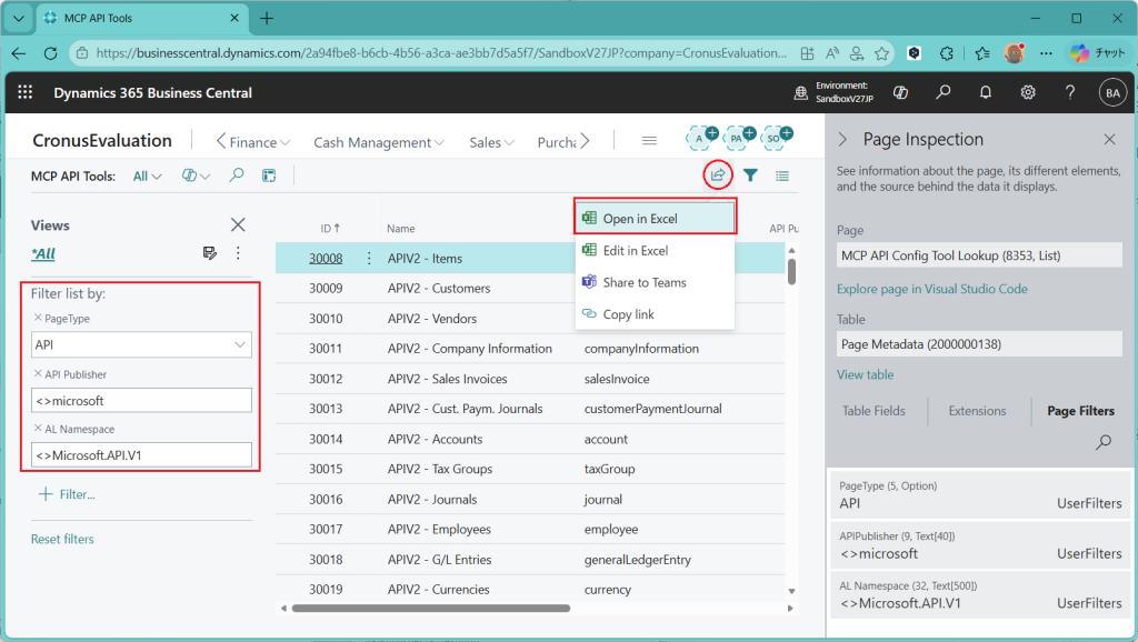 取得可能な一覧をExcelに出力したいのですが、この画面からはExcelに出力できません。こういうときはCtrl+Alt+F1でページ検査モードを開き、ページ番号とフィルタ条件を確認します。