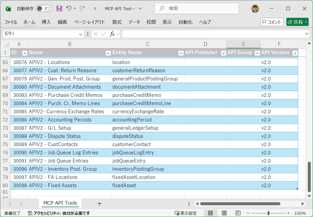 Excelへの出力内容を見てみます。とりあえず個数は79個であることがわかります。結構ありますね。別の機会にじっくり眺めてみることにして、設定を進めます。