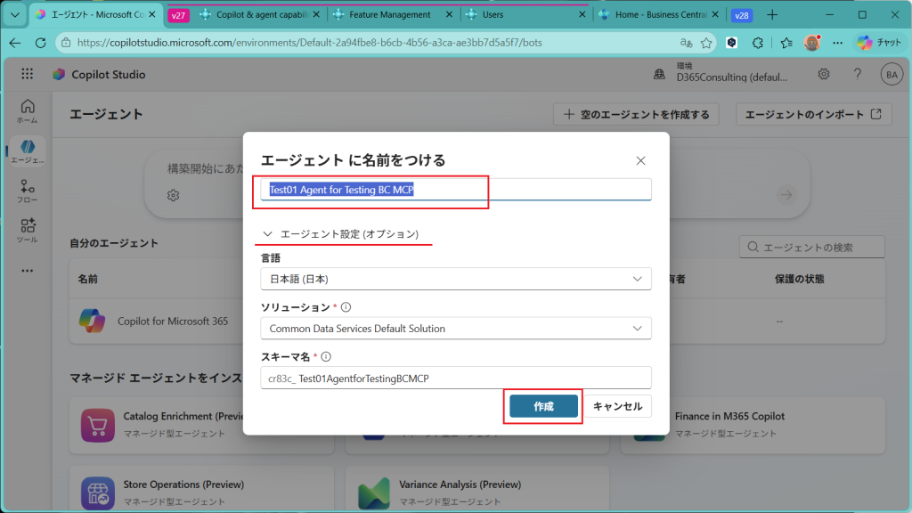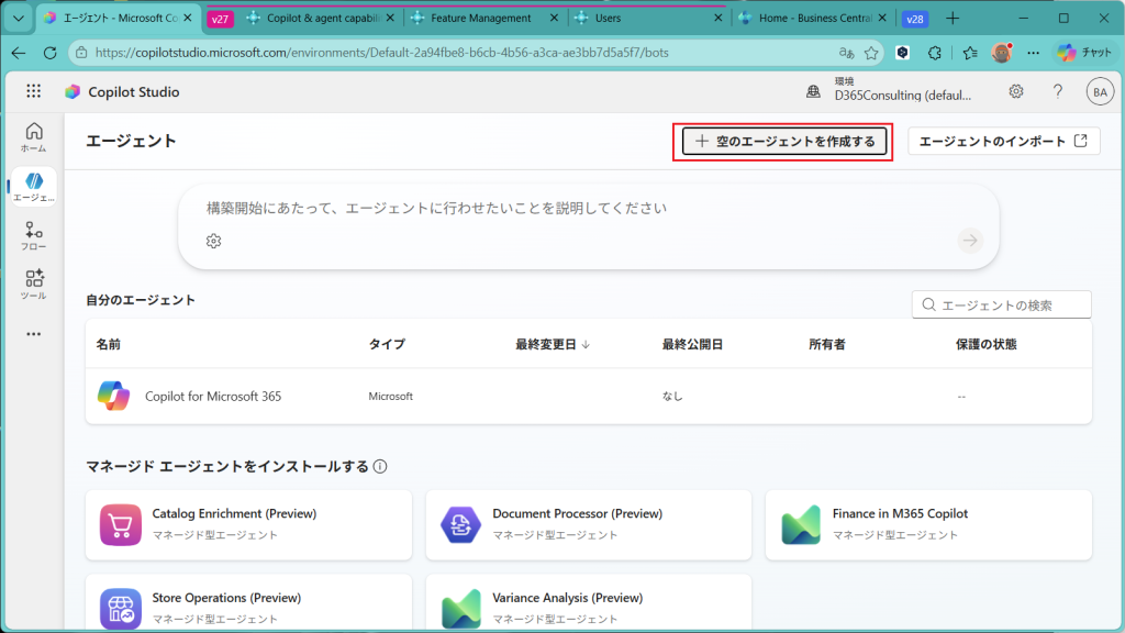 エージェントの一覧画面が開きます。当然、Business Centralのエージェントはまだ存在しないので、”+空のエージェントを作成する”をクリック。