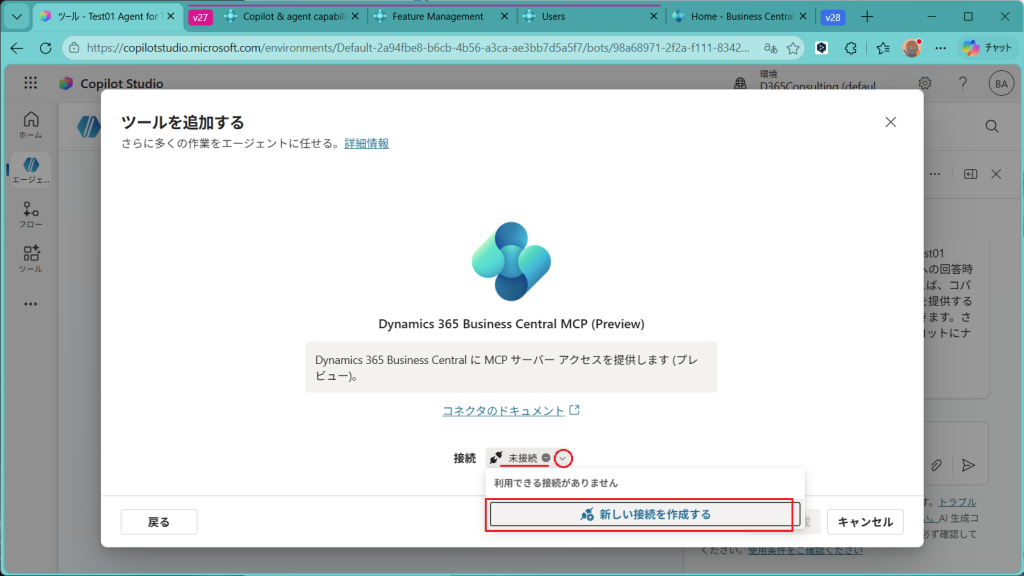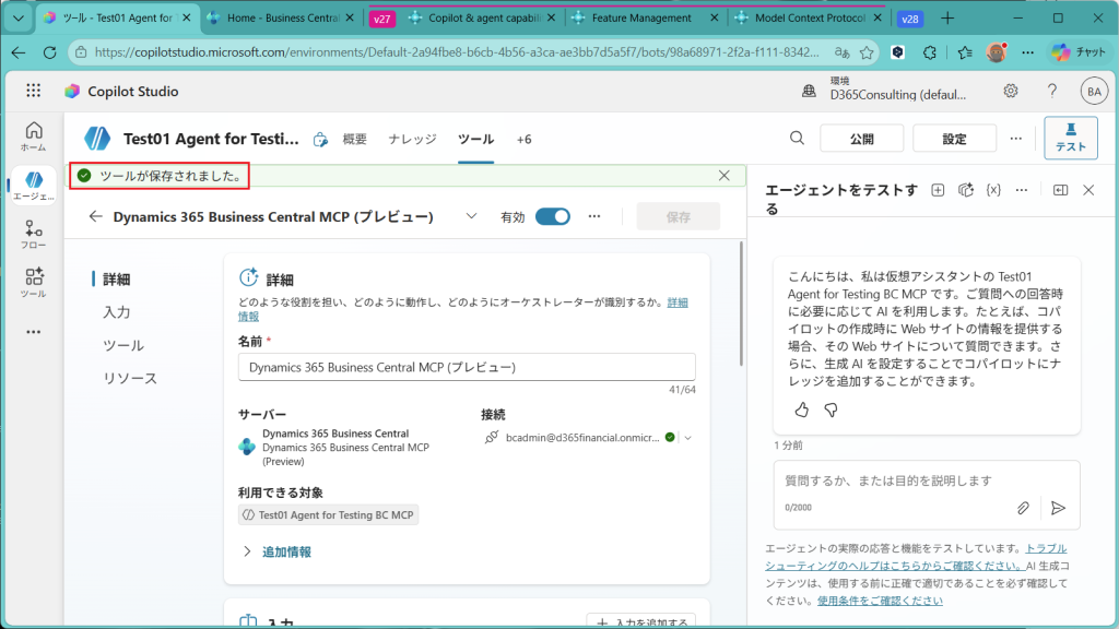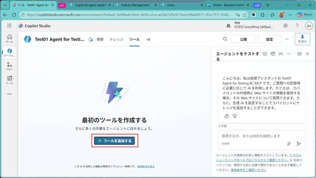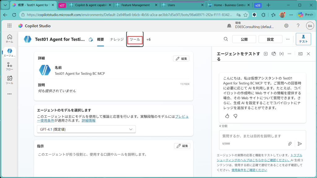 エージェントが作成されました。単に作成されただけで、まだBusiness Centralとはつながっていません。つなげるためには”ツール”から設定していきます。