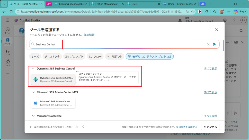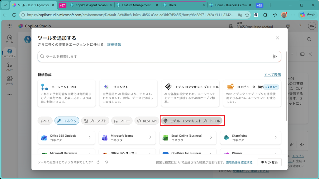 ExcelとかTeamsとかいろいろなコネクタが見えますが、コネクタではなくて”モデルコンテキストプロトコル”タブからBusiness CentralのMCPサーバーを探します。