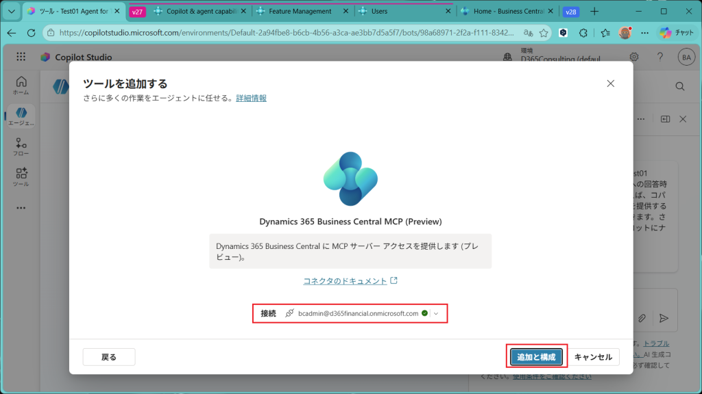 指定した接続を使ってBusiness CentralのMCPサーバーを設定していきます。”追加と構成”をクリック。