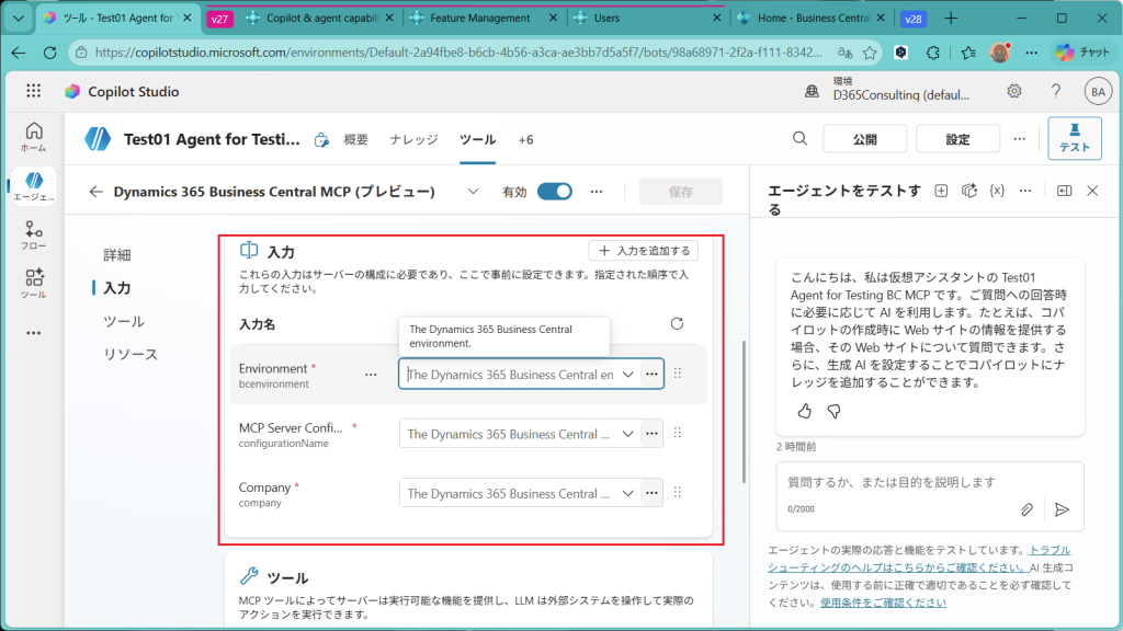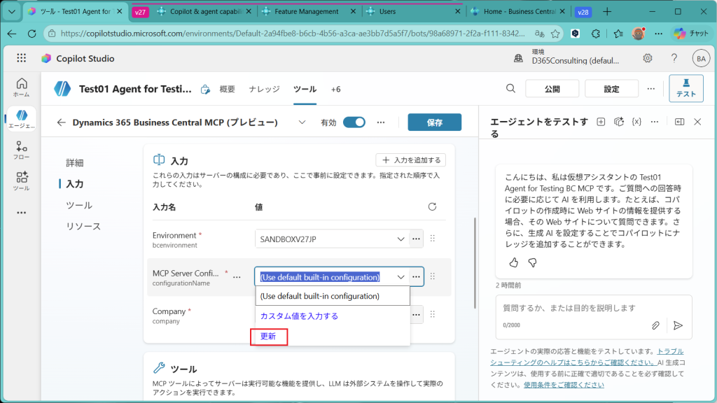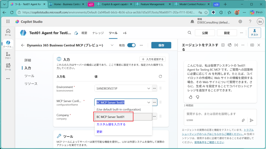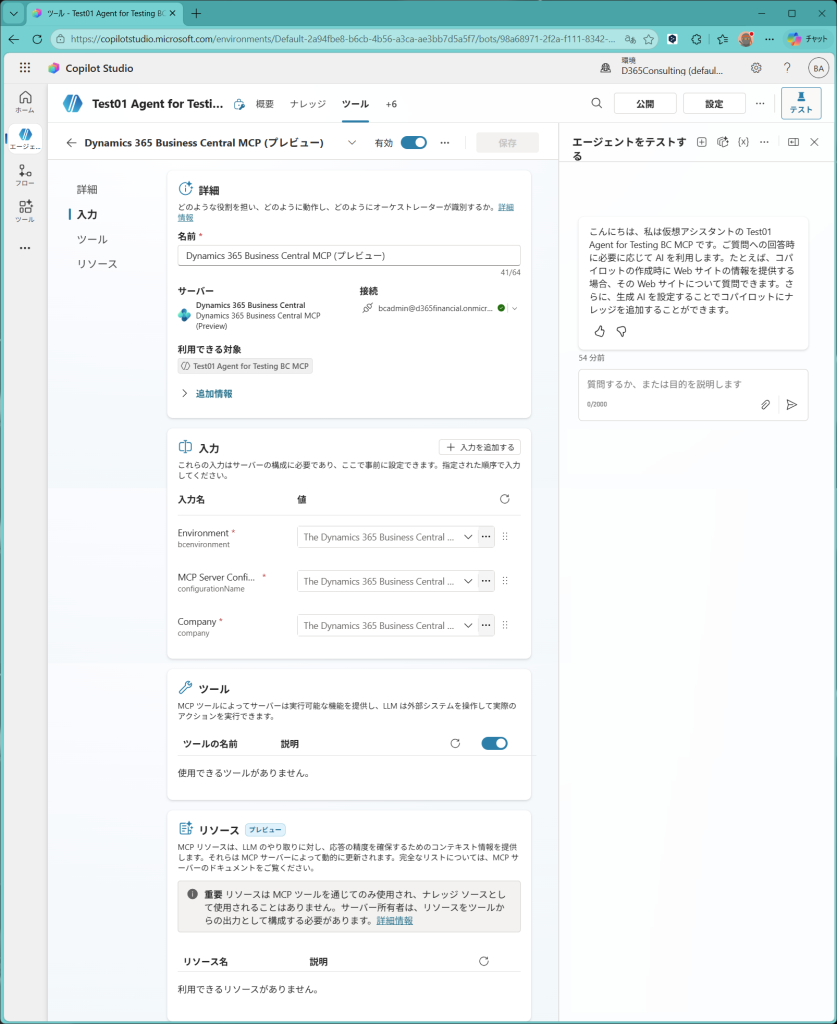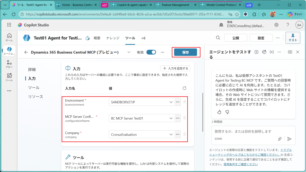 EnvironmentにはSandboxなりProductionなりの環境名を指定します。MCP Server Configurationには先ほど作成したBusiness CentralのMCPサーバー名を指定します。CompanyはMCPサーバーを設定したCompany名を指定します。3つとも指定したら保存。