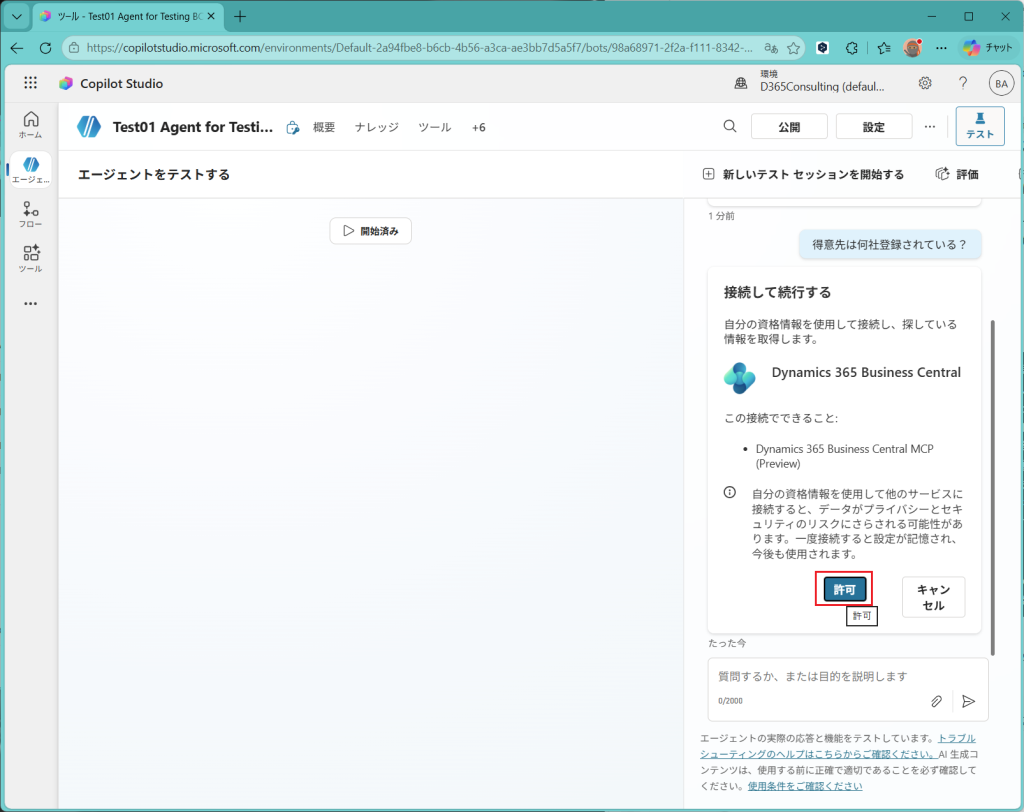 Copilot Studioの画面でテストができます。右側の枠でテストができます。(テストの領域が表示されていない場合は右上の”テスト”ボタンを押すと表示されます。)