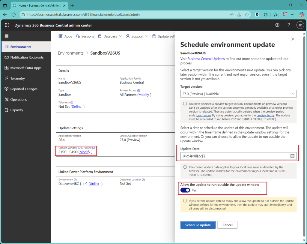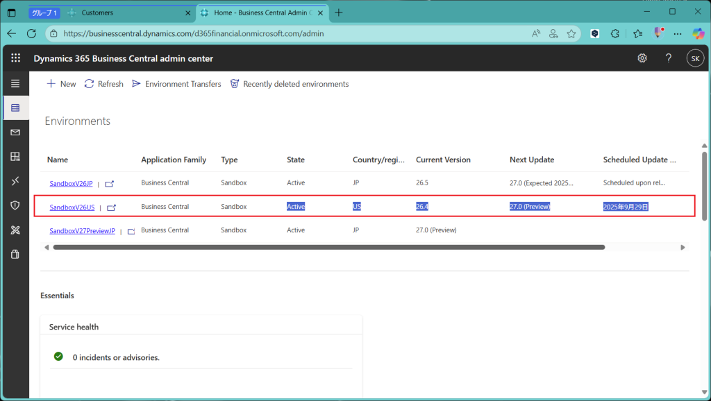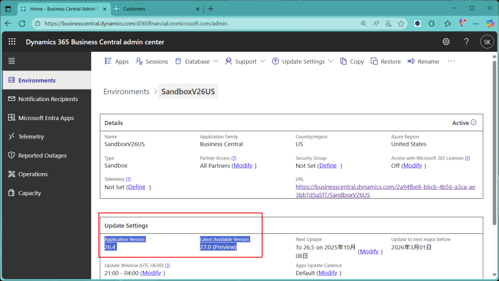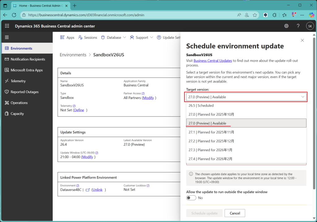 まずはBC Admincenterから対象の環境の詳細を確認します。現在のバージョンはv26.4であり、v27のPreviewバージョンにアップグレード可能であることがわかります。