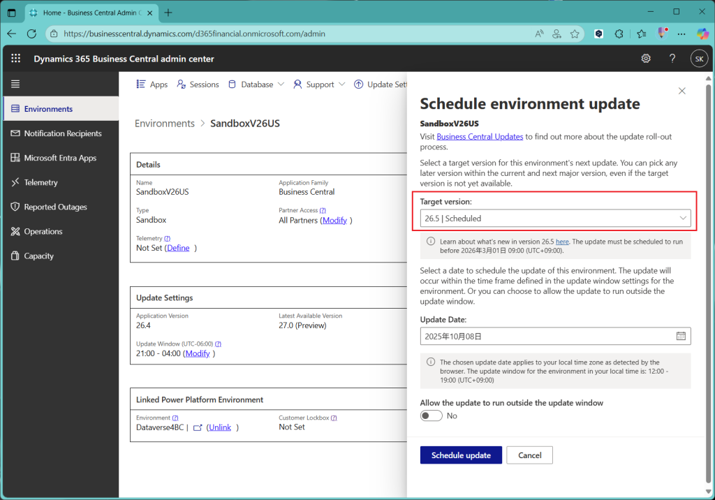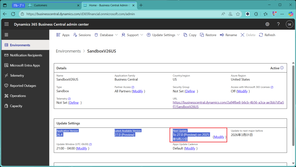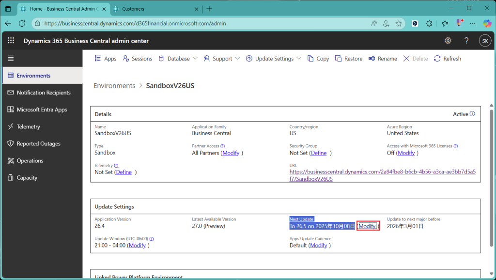 BC Admin Centerの環境の詳細画面に戻り、この環境が次にアップデートされる予定のバージョンと日付を確認します。この例ではv26.5に2025/10/8にアップデートされる予定となっています。Next Update の横の”Modify”をクリックします。