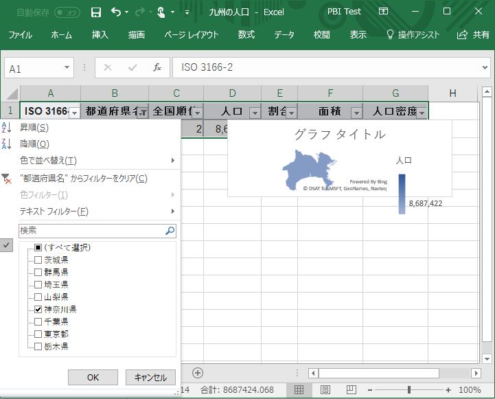 範囲指定した状態でリボンの挿入タブのマップから「塗り分けマップ」機能を選択すると地図が表示されます。初回のみBing送信への同意が必要です。