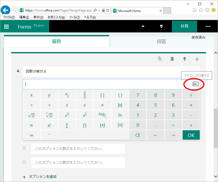 もう少し難しい数式でFormsの「おすすめの結果」の能力を見てみましょう。因数分解の問題を作ります。数式入力は数式パッドでなくても入力できます。右端の「テキストに切り替える」ボタンを押します。
