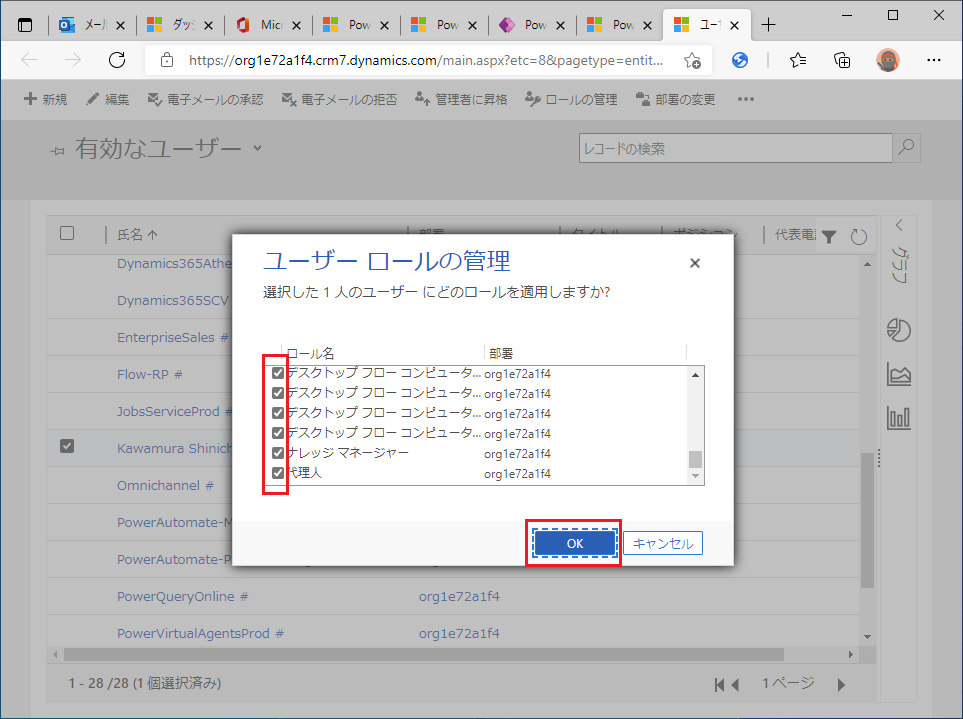 ユーザー一覧が表示されます。自分の管理者IDを選択して「ロールの管理」をクリック。