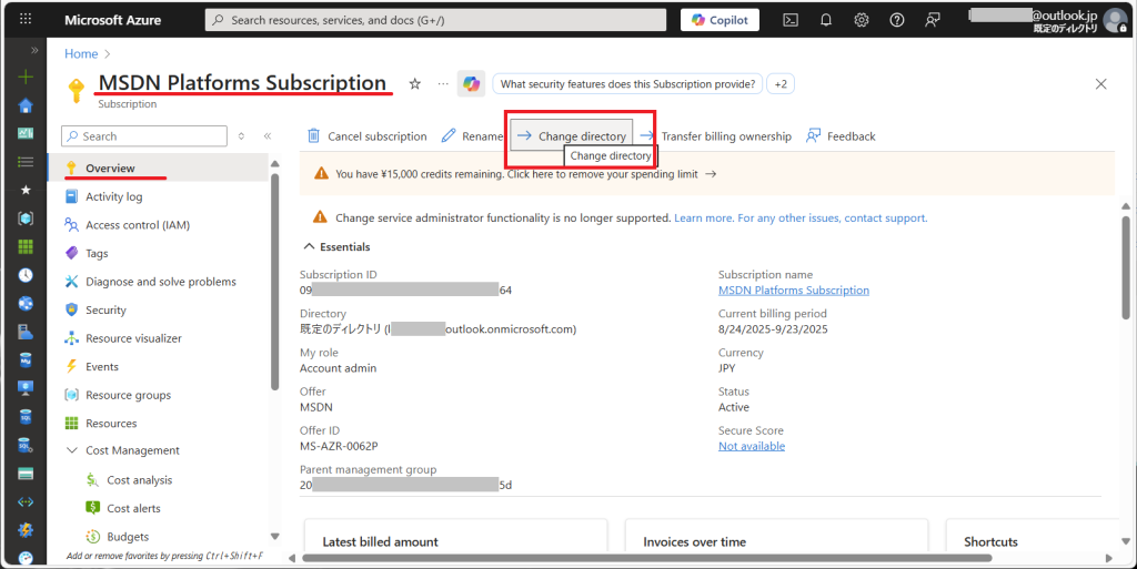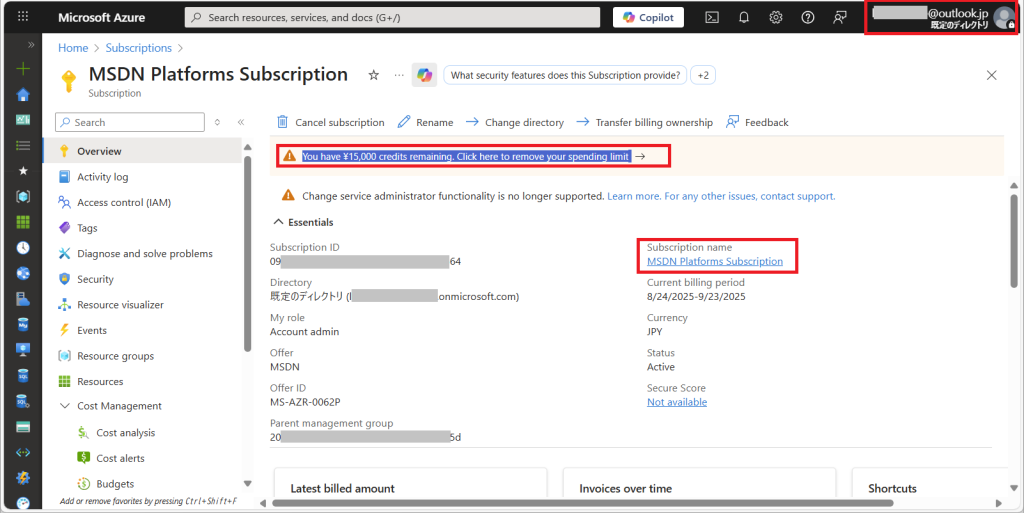 個人アカウント(xxxx@outlook.jp)側で持っているサブスクリプションに15,000円/月のクレジットがついています。