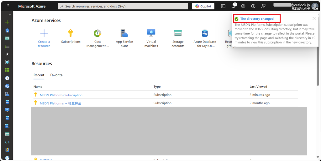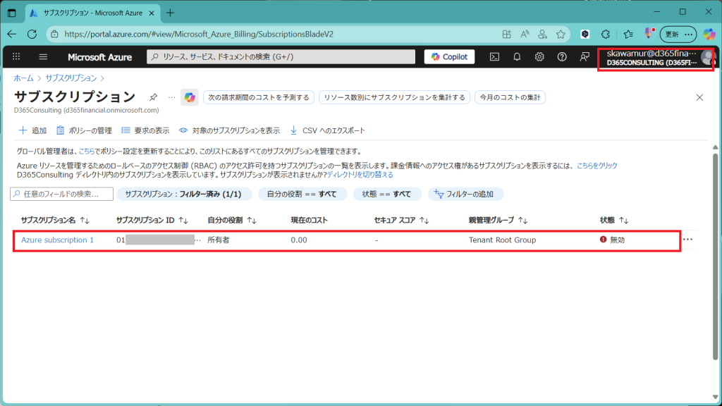 権限付与が完了したので、To側テナントの管理者がサブスクリプション一覧画面を開くと移したサブスクリプションが見えるようになりました。これでAzure無料クレジット付きのサブスクリプションをこの管理者が自由に使うことができます。