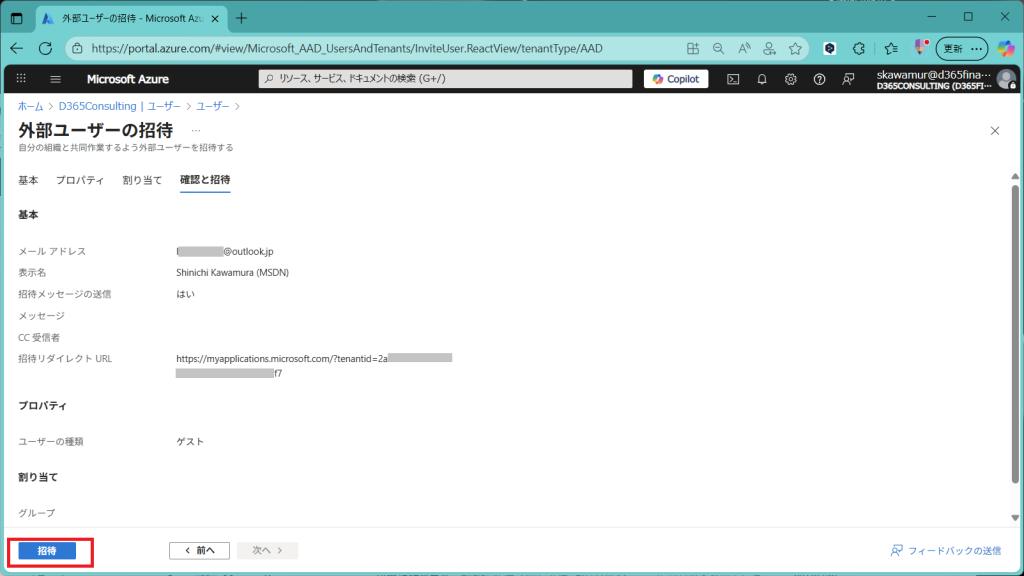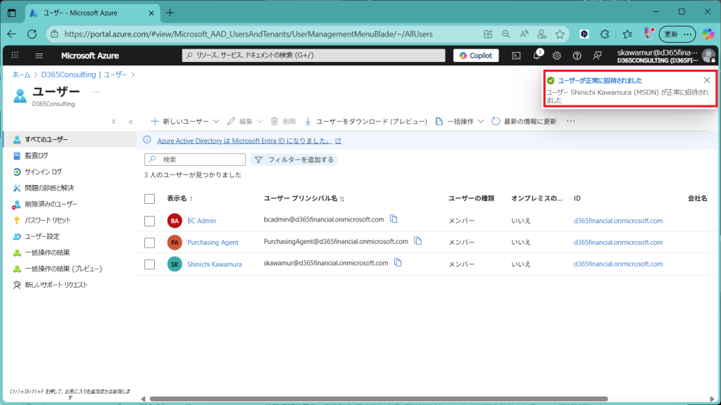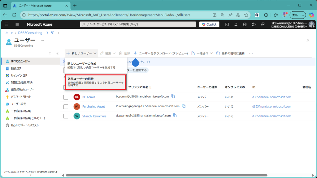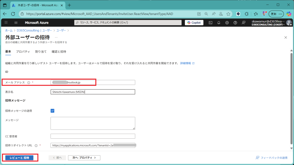 まずはサブスクリプションの移動先(To側)のテナントから、サブスクリプションの移動元(From側)のユーザー(個人アカウントの方)を外部ユーザーとして招待します。