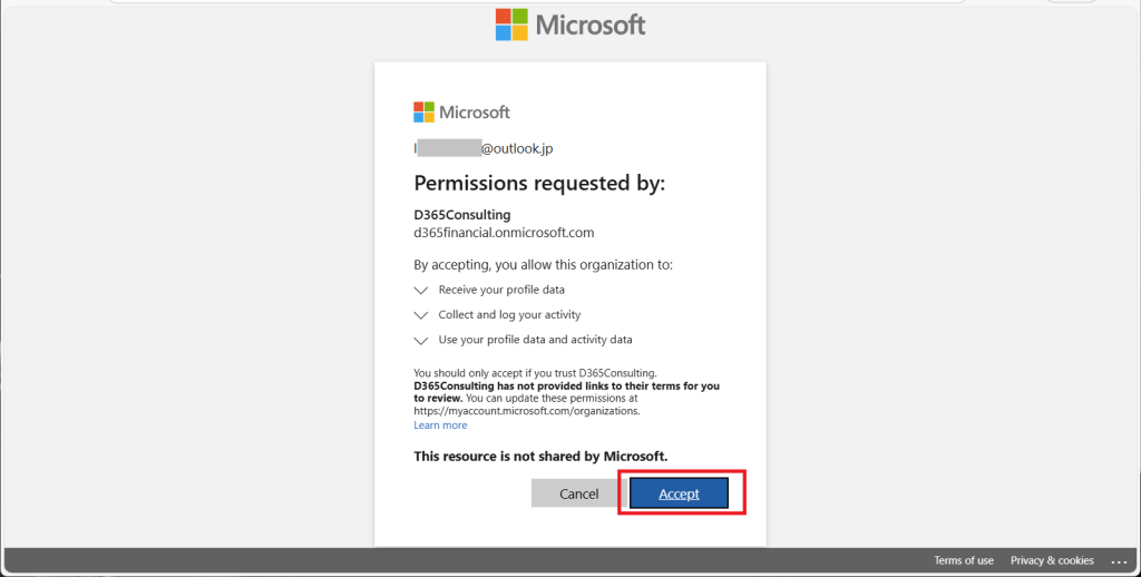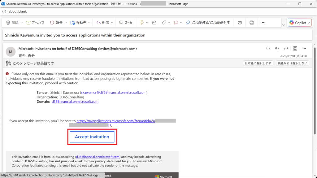 以下のようなメールがFrom側のアカウント(xxxx@outlook.jp)に届くので、「Accept Invitation」をクリック。