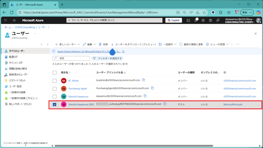 すると、サブスクリプションのTo側のテナント側にFrom側のアカウント(xxxx@outlook.jp)が外部ユーザーとして登録されました。