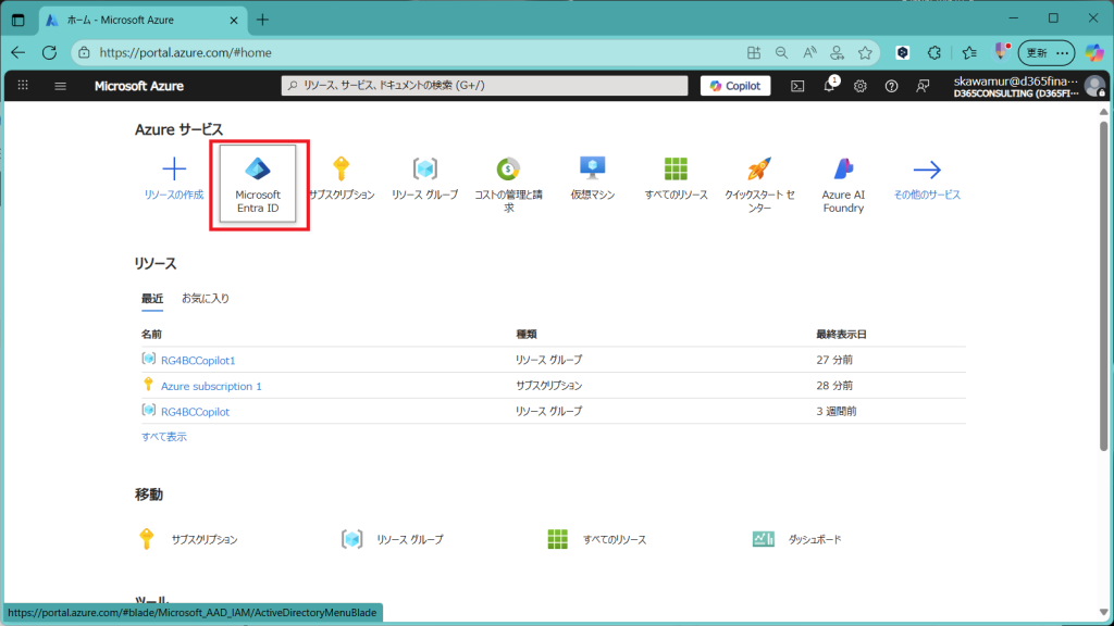 サブスクリプションを移す前に、To側のテナントIDを確認しておきます。To側テナントでHomeからMicrosoft Entra IDをクリック。