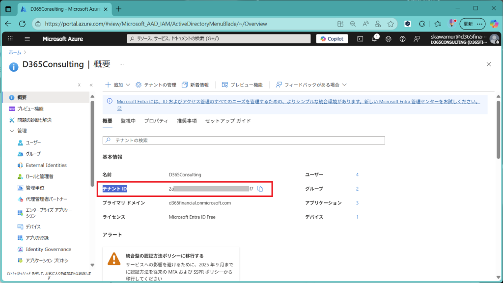 テナントIDを確認してメモしておきます。To側は今回の例では ”2a..(中略)..f7” です