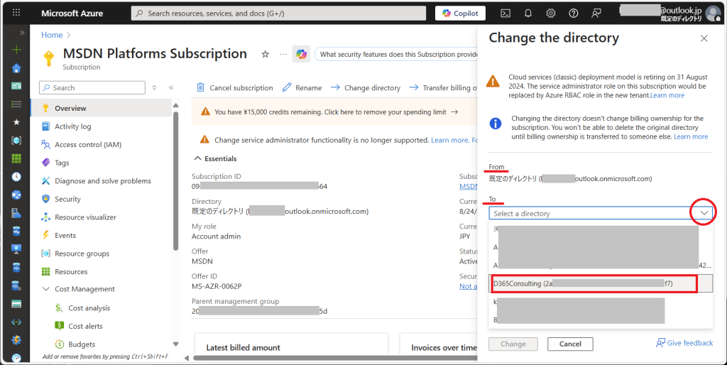 From側のサブスクリプションの概要画面を開きます。ここで「->Change Directory」をクリック。(ここはAzureの知識不足でうまく説明できないのですが、「テナントを移す」のではなく「Directoryを変更する」という処理になります。)