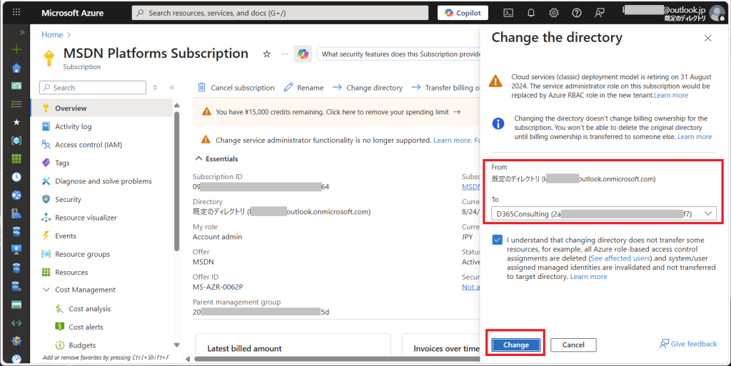 - 外部ユーザーの招待を受諾すると、サブスクリプションの所有者(移動元テナントの管理者)は「サブスクリプションのディレクトリ変更」機能を使って移動先テナントにサブスクリプションを移動できるようになるので移動する。
