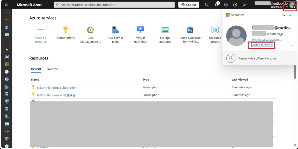 手順としては、まずはFrom側テナントの管理者(xxxx@outlook.jp)がAzure Portalに入り、右上のアカウントをクリックして表示される名前の下の「Switch directory」をクリックします。