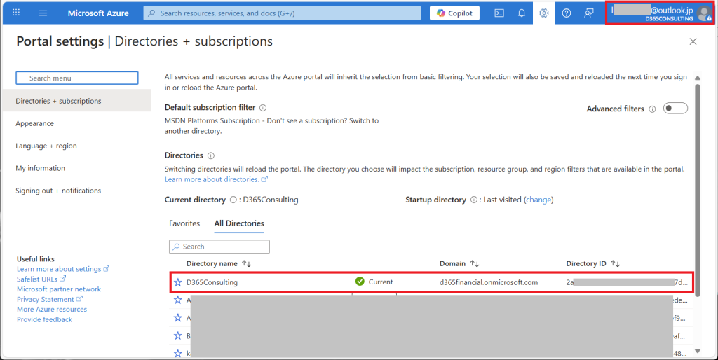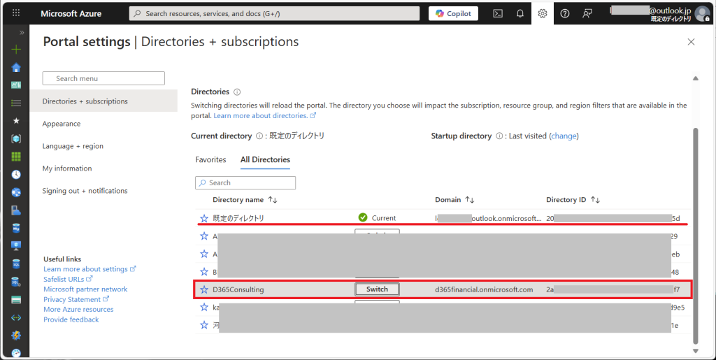 現在のディレクトリはFrom側(xxxxoutlook.onmicrosoft.com)であり、切替先候補としてTo側が表示されていることがわかります。ここでTo側の「Switch」をクリック。