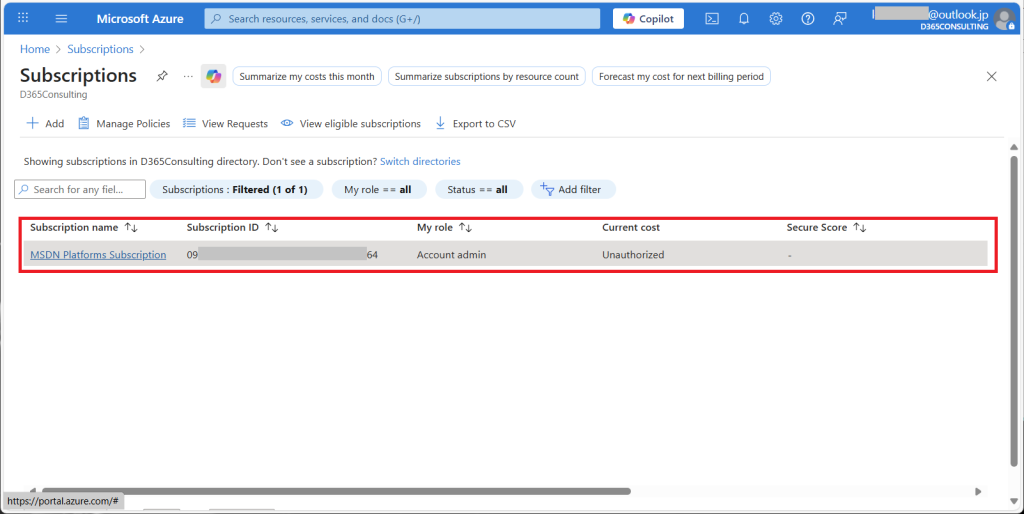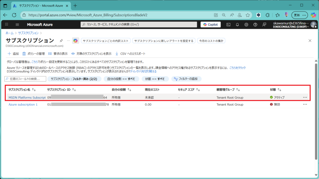このクレジット付きのサブスクリプションを組織アカウント側のテナントのAzureサブスクリプションに移動する。(赤枠囲みの下の2行目は期限切れで使えなくなったサブスクリプションで、これとは別に赤枠のサブスクリプションが追加されるイメージ。)※BCのCopilot/Agentを使いたいのはこの組織アカウント側のテナントです。