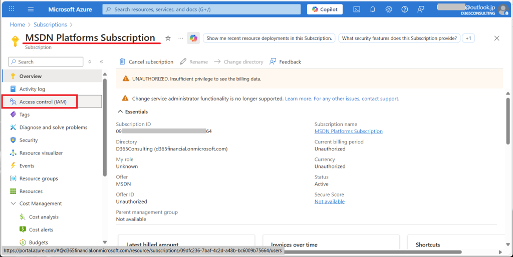 From側テナントの管理者(xxxx@outlook.jp)が招待されたTo側テナントに入った状態で、To側テナントの管理者にサブスクリプションの権限を付与します。サブスクリプションの画面でAccess Controlをクリック。