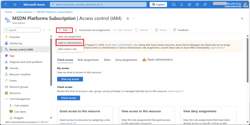 - サブスクリプションを移動したのち、サブスクリプションの所有者(移動元テナントの管理者)は移動先テナントの管理者に管理者権限を付与する。