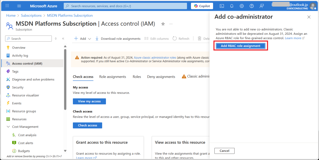 「Add RBAC role assignment」を選択。(この辺り、背景色が薄橙色の注意メッセージを読む限り、最近やり方が「RBAC」方式とやらに変更されたように見えます。まあ、気にせず進めましょう。)