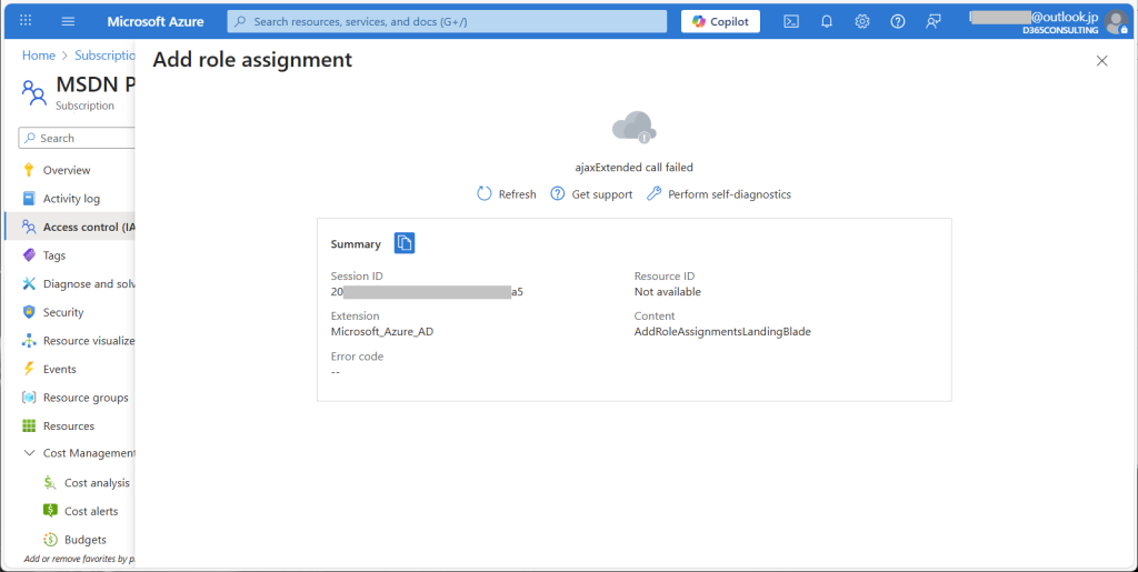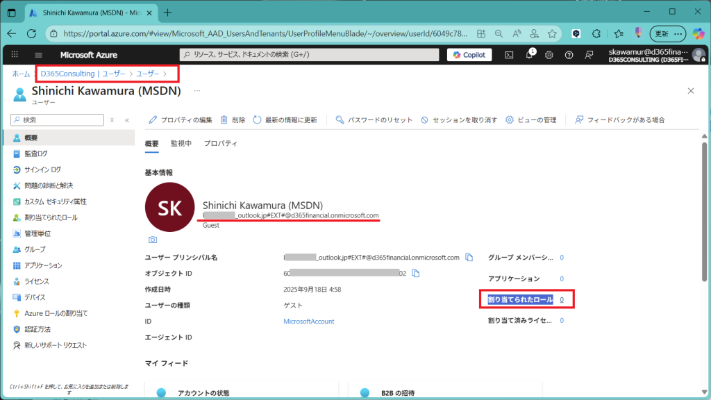 これを解決するには、To側テナントの管理者が招待したFrom側テナントの管理ユーザー(xxxx@outlook.jp)に閲覧権限を付与する必要があります。To側テナントの管理者でAzure Portalにはいり、From側テナントのユーザー設定画面を開き、「割り当てられたロール」の数字部分の ”0” をクリック。