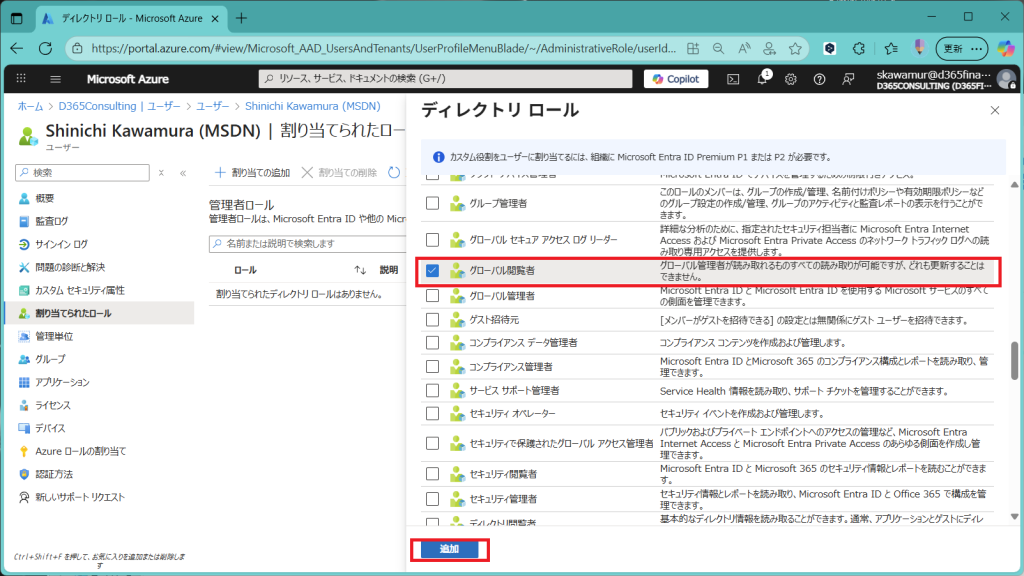 グローバル閲覧者権限を選択して「追加」。(この辺、会社の環境でやるときはもう少し絞ったほうがいいかも)