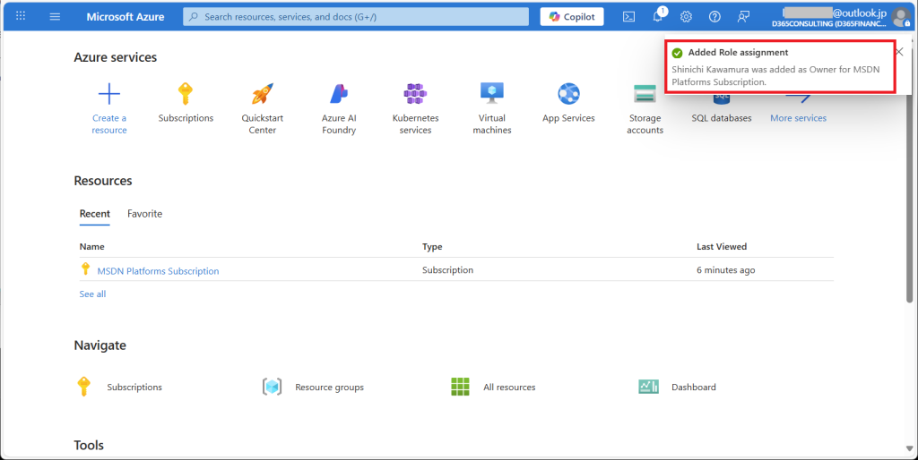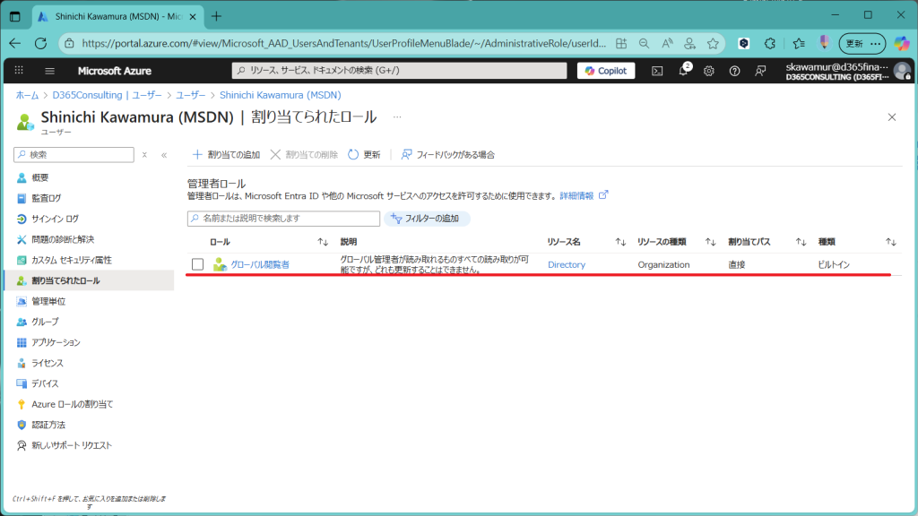 グローバル閲覧者ロールが招待したFrom側ユーザー(xxxx@outlook.jp)に付与されました。