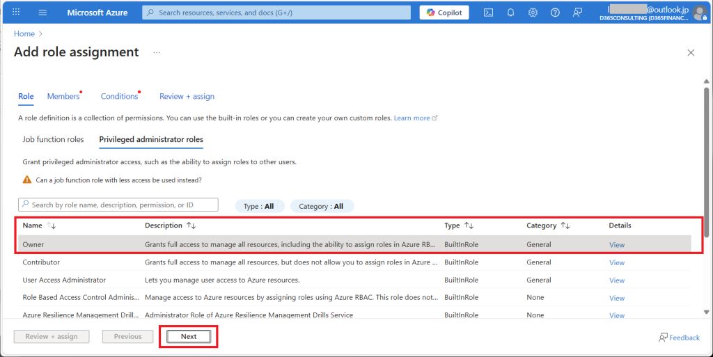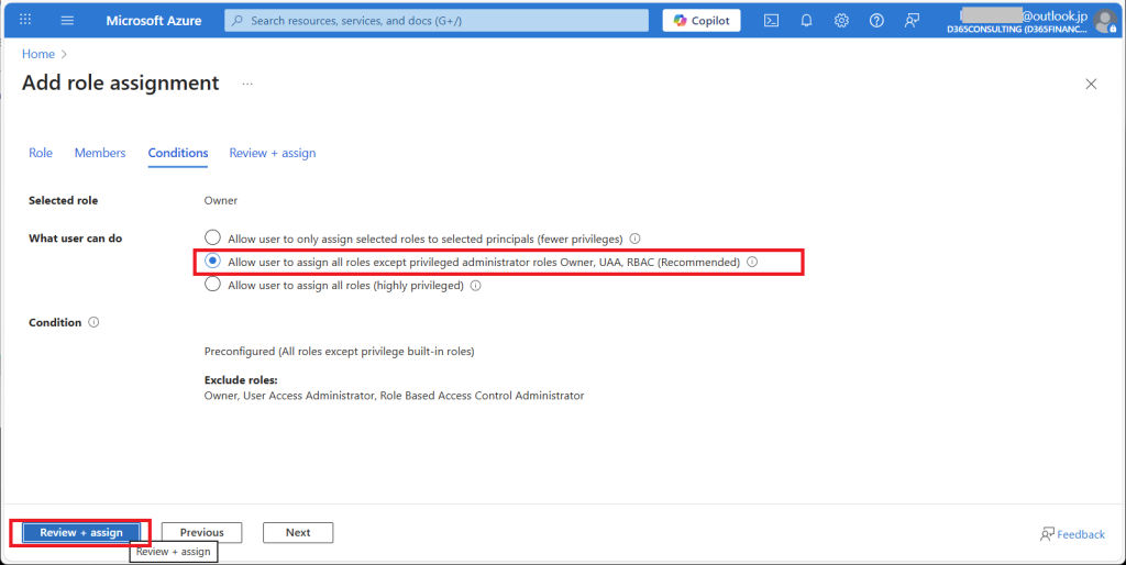 Ownerとしての権限の付与レベルを指定します。細かい検証はしていませんが、RBACと書かれているRecommendedの権限を付与しておきます。(Azureプロフェッショナルの方に怒られそうですw)