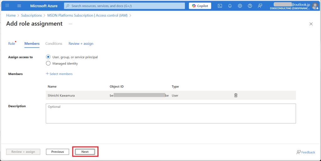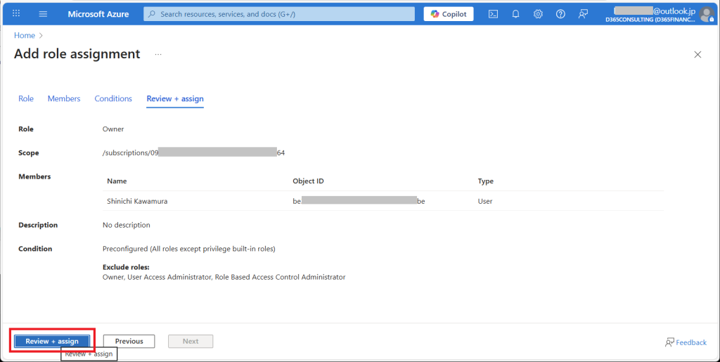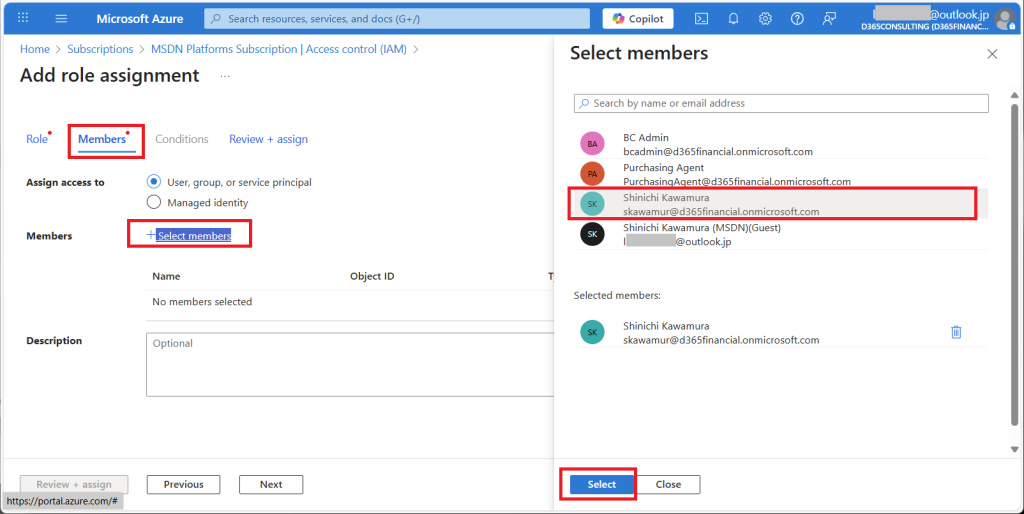 外部ユーザーとして招待されたFrom側テナントの管理者のAzure Portal画面に戻り、改めてロールを割り当てます。(が、、ここでCo-AdministratorではなくOwnerを選んでしまいました。。本当は「必要最低限」の権限を付与したほうが良いのですが、個人環境の検証なのでこのまま進めます。)