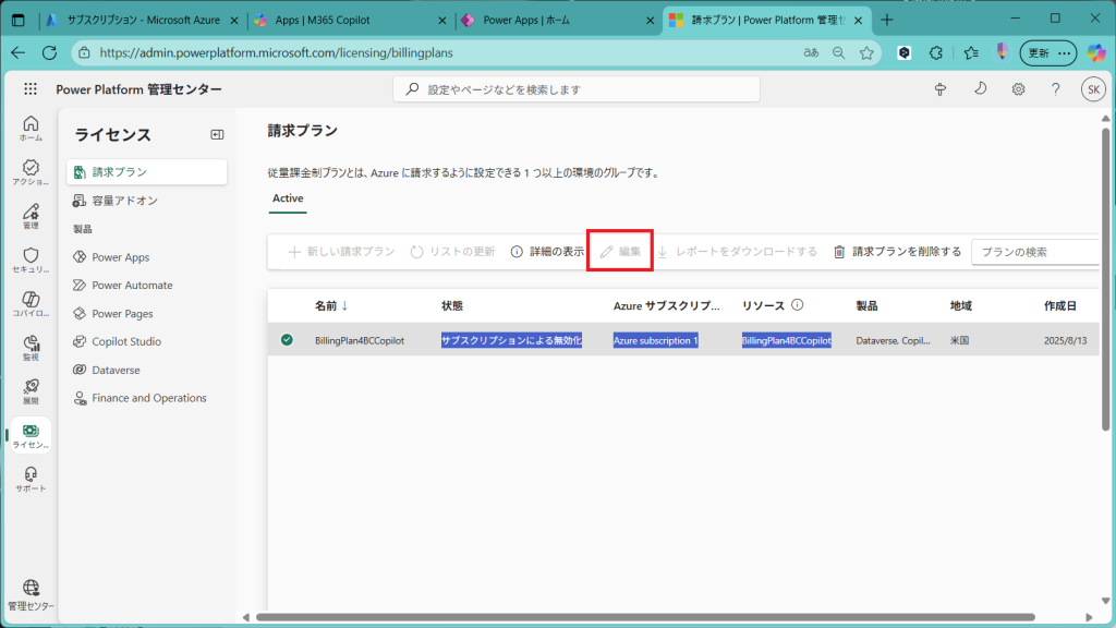 移したAzureクレジットを実際にBCで使うにはもう少し設定が必要です。Power Platform Admin Centerで前回作成した請求プランに紐づいているAzureサブスクリプションを今回移したサブスクリプションに切り換えれば良いだろう、と思って見に行くと編集できません。。おそらくサブスクリプションが有効期限切れだからだと思われます。