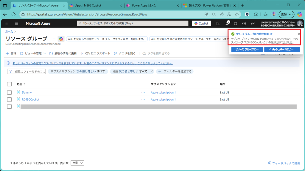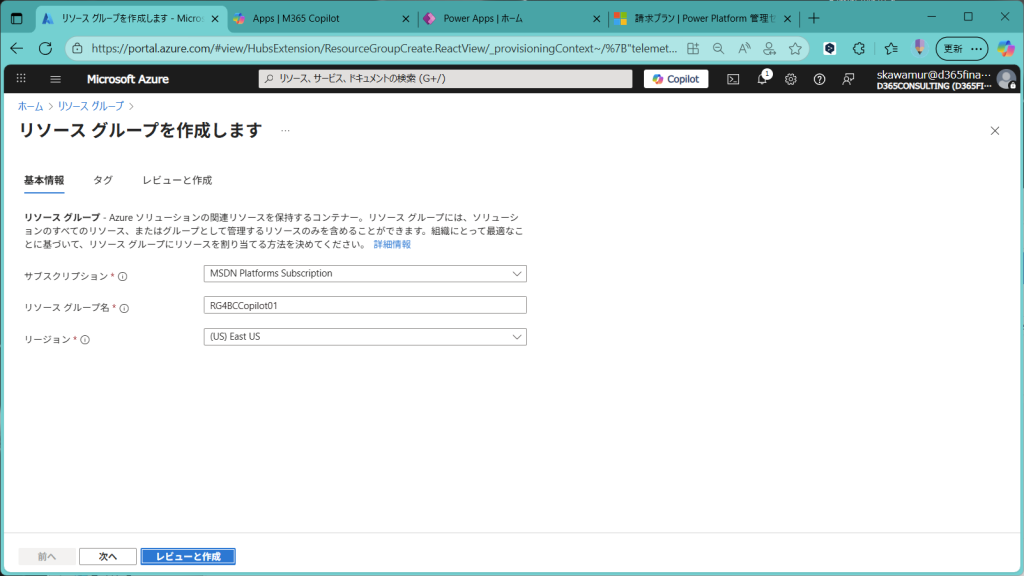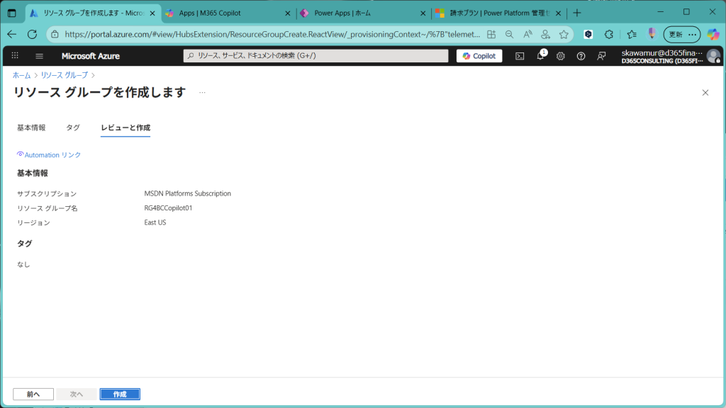 面倒くさいですが、前回同様にリソースグループから作り直します。移動したサブスクリプションを使って新規作成。