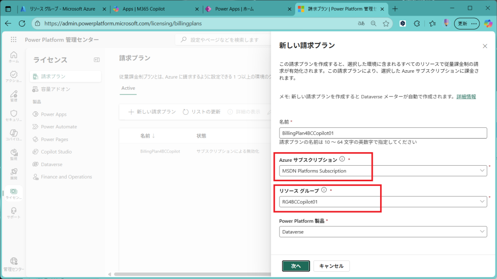 Power Platform側でも請求プランを新規作成。ここで移したサブスクリプションと新規作成したリソースグループを指定。