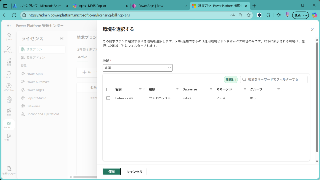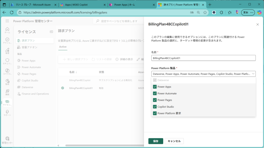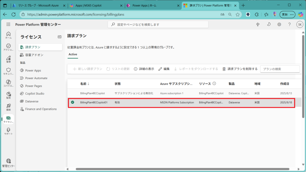 前回同様、必須ではないけどPower Appsとかもこの請求プランに紐づけておく。(Copilot Studioも紐づけられるのね。いま気づいた。それは夢が広がる。)