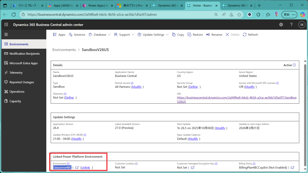 BCのAdmin CenterのEnvironment設定画面。リンク先のDataverse環境は変わっていないので、ここは設定変更の必要なし。